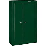 The Stack-On 10-Gun Convertible Double Door Gun Cabinet can be set up to hold 10 firearms. Adjustable, removable shelves and fully carpeted interior. Tested and listed as California Department of Justice firearms safety devices that conform to the requirements of California Penal Code Section 12088. Reinforced, full-sized steel door with 3-point locking system. Cabinet has a hunter green epoxy paint finish with gold accents. Mount Type: Floor, Material: Steel, Lock Type: Keyed drawbolt, Dimensions W x D x H (in.): 33 7/8 x 15 1/4 x 57 Tested and listed as a California DOJ Firearm Safety Device Reinforced, full-sized steel door 3-point locking system Holds 10 firearms up to 54in. tall Foam padded bottom